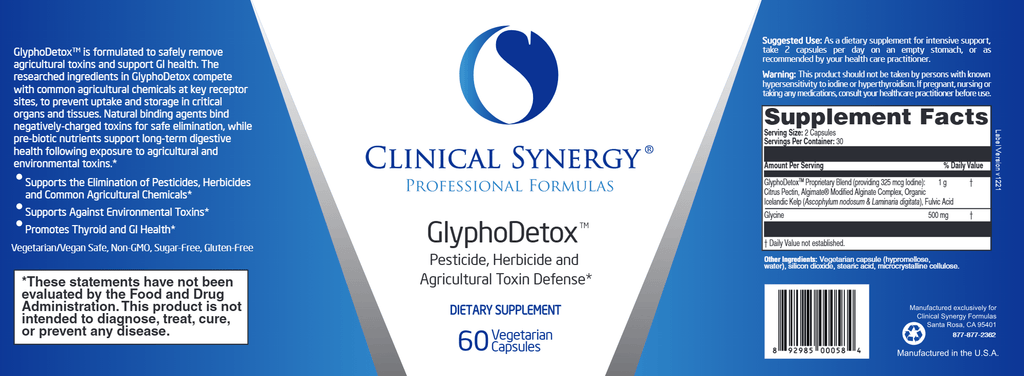 GlyphoDetoxTM is formulated to safely remove agricultural toxins and support GI health. The researched ingredients in GlyphoDetox compete with common agricultural chemicals at key receptor sites, to prevent uptake and storage in critical organs and tissues. Natural binding agents bind negatively-charged toxins for safe elimination, while pre-biotic nutrients support long-term digestive health following exposure to agricultural and environmental toxins.*