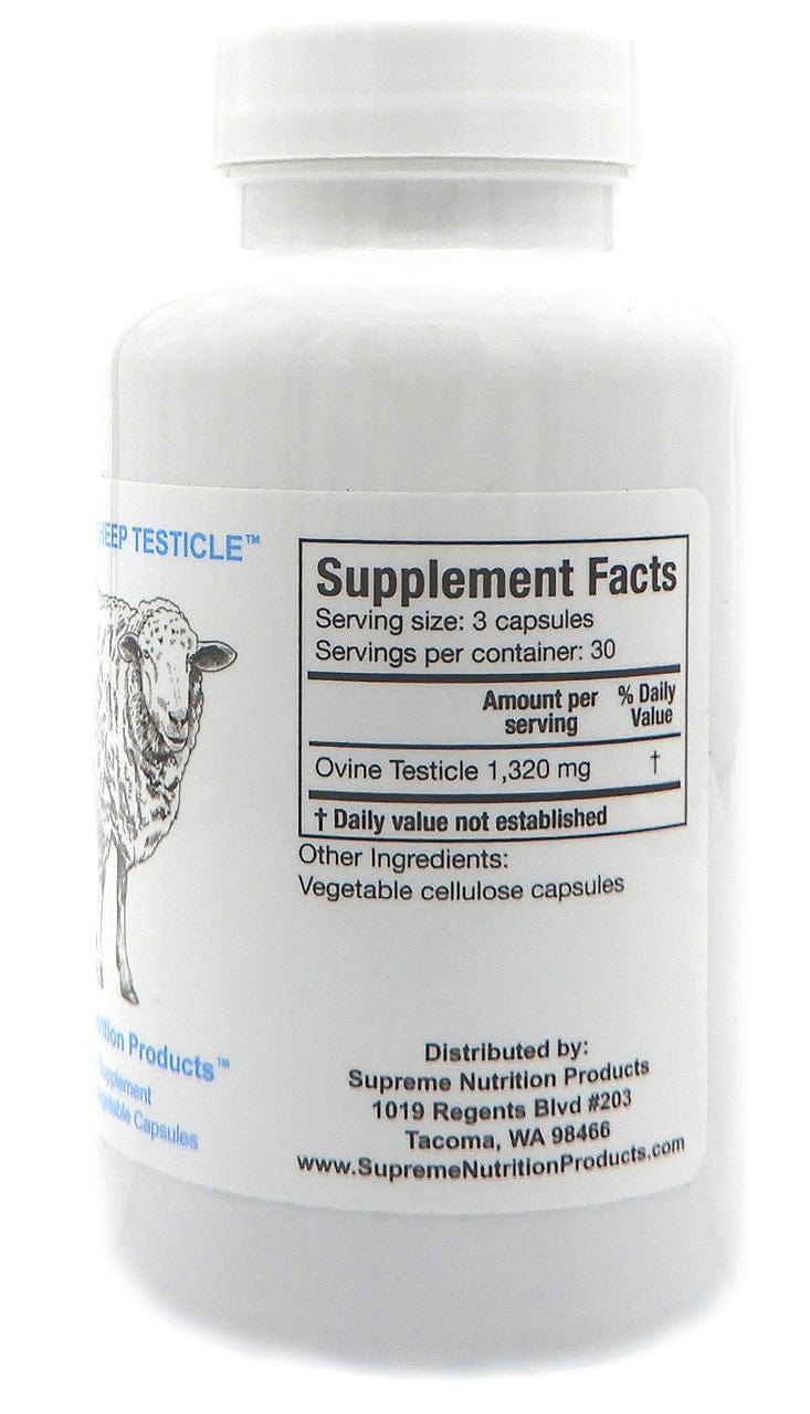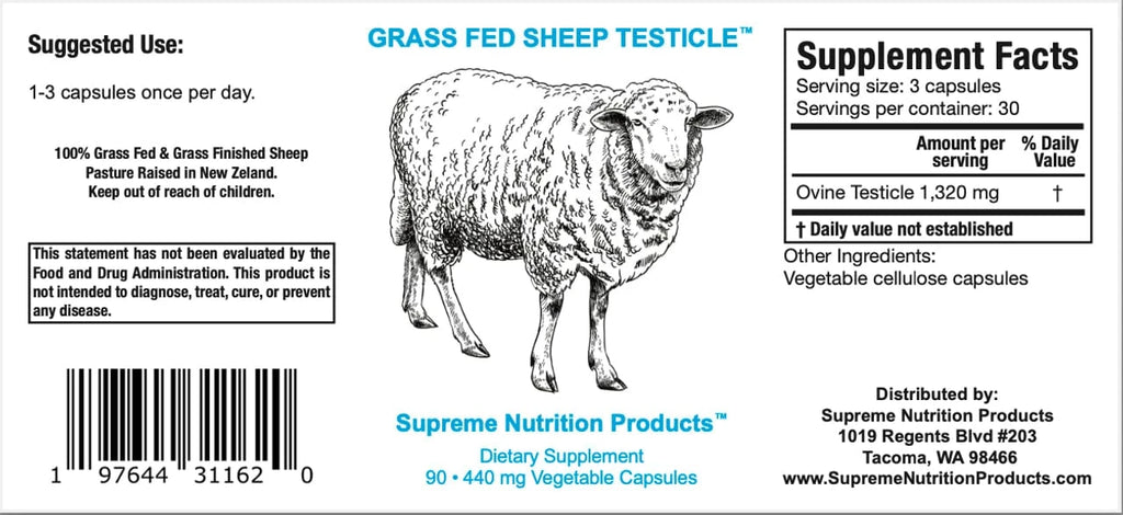 Ingerdients and Dosage:Grass Fed Sheep Testicle is packaged in a bottle containing 90 veggie capsules, each containing approximately 400 mg of powdered Ovine testicle without fillers, binders or excipients. 1-3 capsules once per dayWarnings
