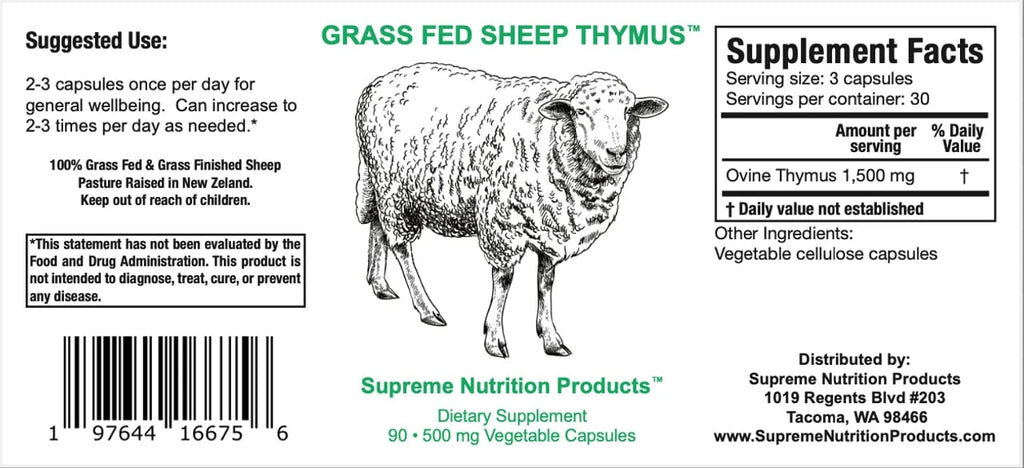 Grass Fed Sheep Thymus is packaged in a bottle containing 90 veggie capsules, each containing approximately 500 mg of powdered Ovine Thymus without fillers, binders or excipients. 2-3 capsules once per day for general well-being. Can increase to 2-3x per day as needed