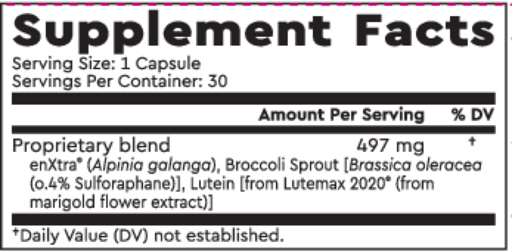 enXtra® (Alpinia galanga), Broccoli Sprout [Brassica oleracea (0.4% Sulforaphane)], Lutein [from Lutemax2020® (from marigold flower extract)]