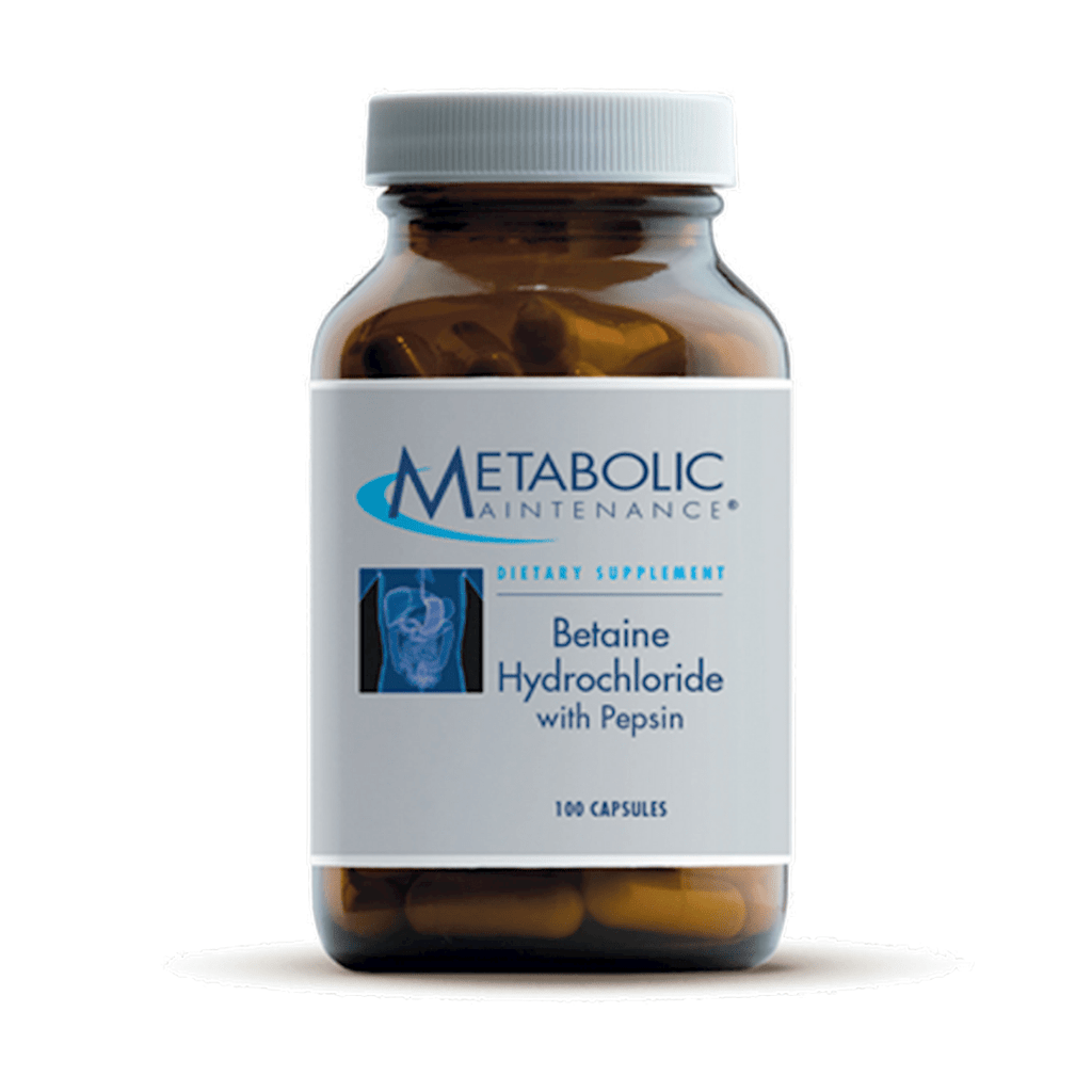 Betaine Hydrochloride with Pepsin, taken with meals, supports normal digestion. Betaine hydrochloride may lower the pH (increase acidity) of stomach contents for more effective digestion of food and therefore increase the availability and absorption of otherwise bound nutrients. Pepsin is a protease that naturally aids in the breakdown of dietary protein into small peptides for absorption. Betaine hydrochloride should be avoided by those with hyperchlorhydria and stomach ulcers or cancers. *