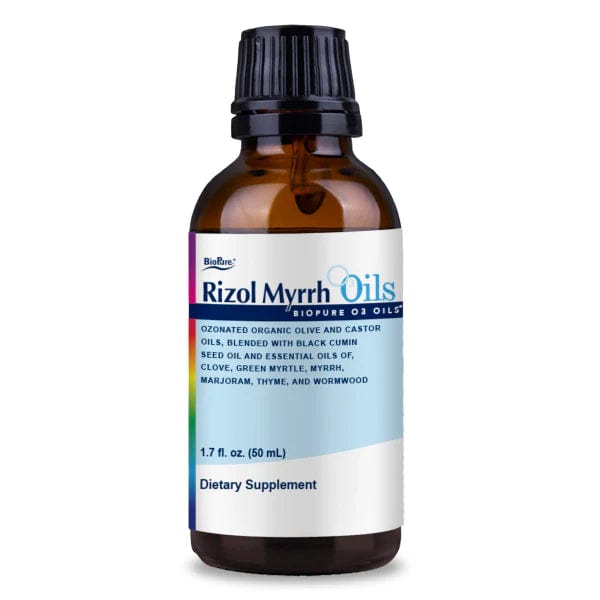 BioPure O3 Oils® Rizol Myrrh is a blend of organic ozonated olive and castor oil and the following essential oils – black cumin seed, clove, green myrtle, myrrh, marjoram, thyme, and wormwood. This powerful combination supports the body’s natural defenses and provides broad-spectrum microbial balance support.*