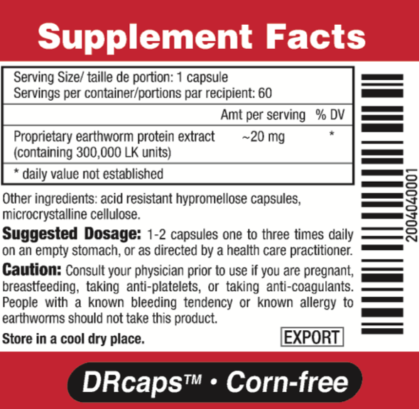 Proprietary earthworm protein extract (containing 300,000 LK units), 20 mg, Other ingredients: Acid resistant hypromellose capsules, microcrystalline cellulose