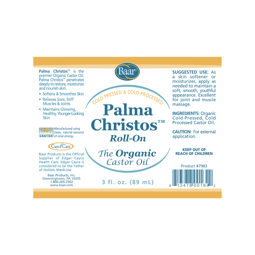 Baar Products' organic Castor Oil is trademarked as Palma Christos. It is organic, cold-pressed and cold-processed Castor Oil. Palma Christos™ has all of the benefits of our Palma Christi Castor Oil with the added bonus of being organic.