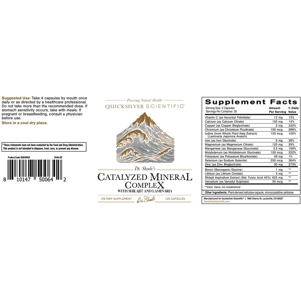 Dr. Shade’s Catalyzed Mineral Complex is a comprehensive blend of macro minerals and trace minerals to support a healthy mineral status and the many processes of detoxification. Unique to this foundational mineral complex is the organic Himalayan resin Shilajit, rich in fulvic acid to help transport minerals to cells, and Laminaria, a brown seaweed rich in iodine and other bioactive compounds aiding metabolic optimization.