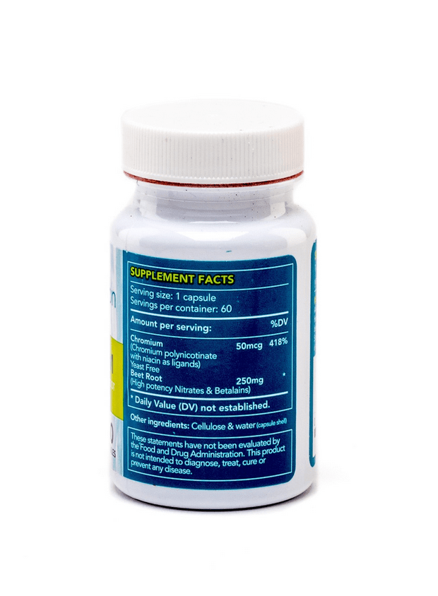 A potent form of trivalent chromium presented in a food-derived organic carrier of Niacin. Each capsule provides 500 micrograms of trivalent chromium polynicotinate (50mcg of elemental chromium) and 250 mg of High Active red beet root with a standardized 10,000ppm plant nitrate, which the body converts to nitric oxides (McDonagh et al., 2018).