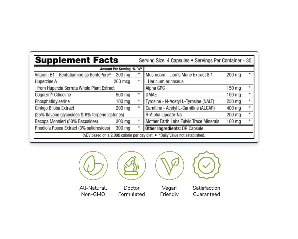 Cognizin® Citicoline, Synapsa™ Bacopa Monnieri Extract, Alpha-GPC (Alpha-glycerophosphorylcholine) from Sunflowers, Virtiva® Plus Phosphatidylserine and Ginkgo biloba extract, Huperzine A (from Huperzia Serrata Whole Plant Extract), Rhodiola Rosea Extract (3% Salidrosides), Magnesium, N-Acetyl-L-Tyrosine, Acetyl L-Carnitine, Betaine TMG