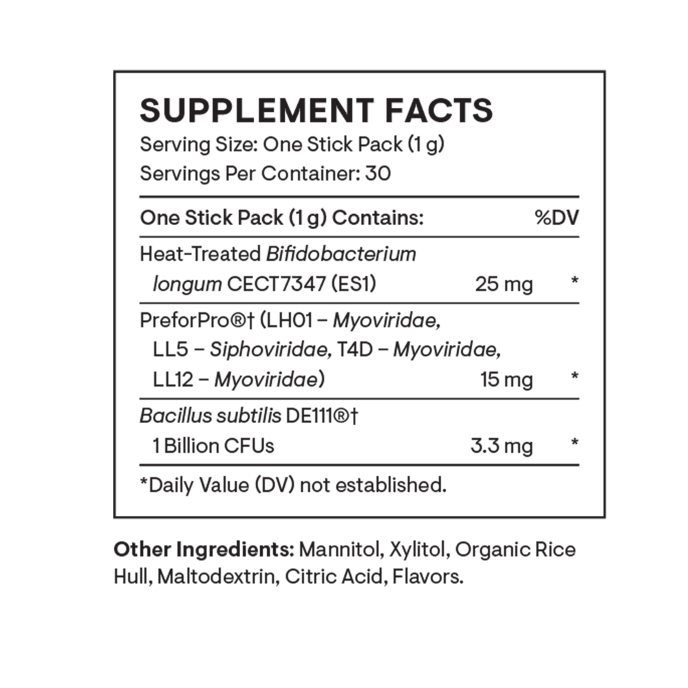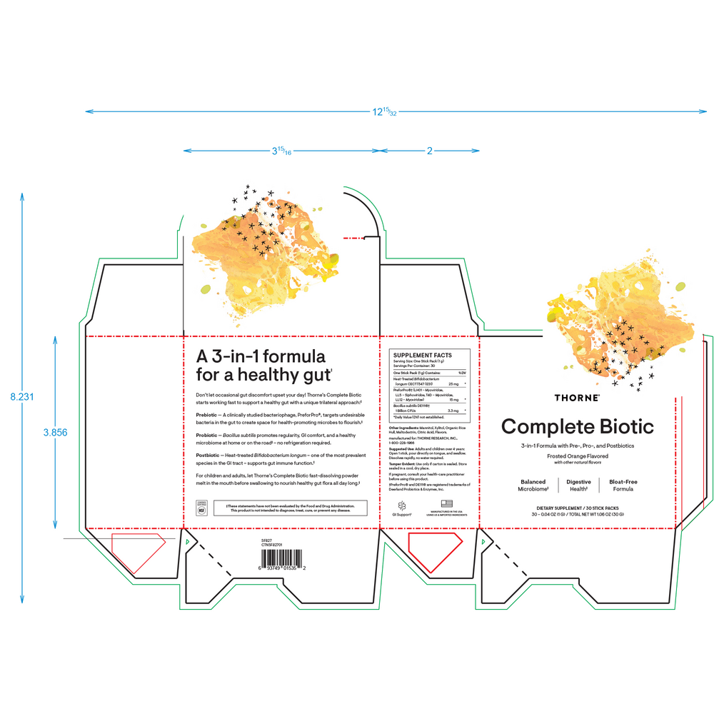 Complete Biotic is a clinically-backed combination of one prebiotic, one probiotic, and one postbiotic in a fast-melt, orange-flavored powder – one serving per stick pack. Complete Biotic provides extensive support for a healthy microbiome with well-studied biotics to benefit bowel regularity, stool consistency, intestinal comfort, and growth of beneficial bacteria in favor of less beneficial bacteria.*