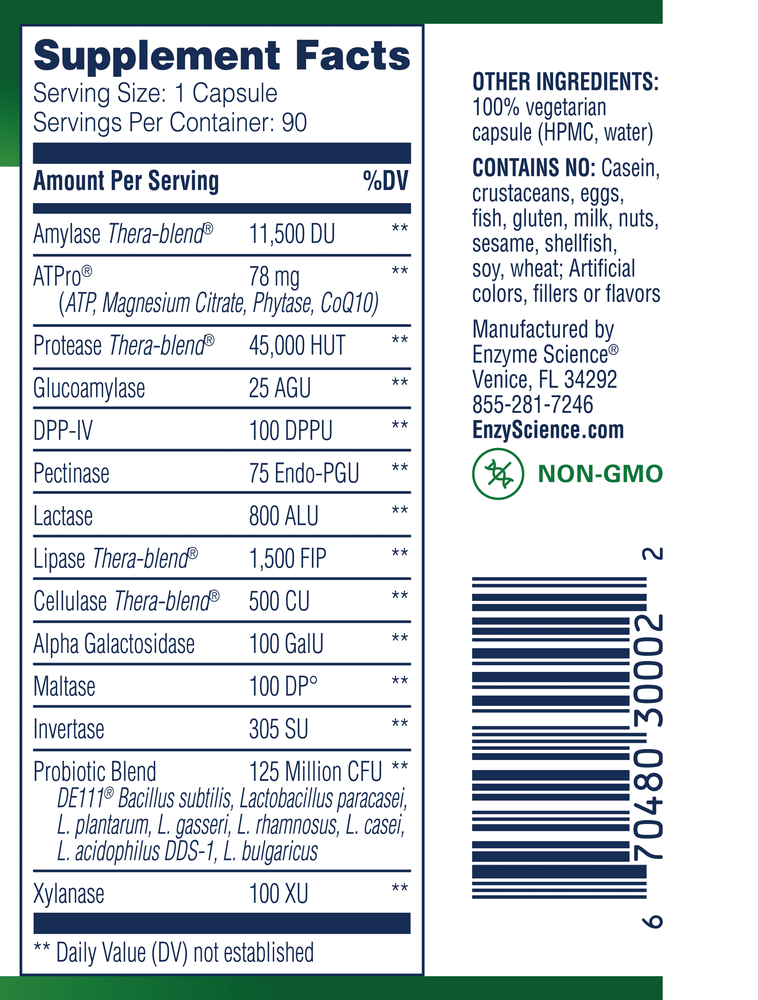 Enzyme Science formulates each enzyme focused product with exclusive Thera-blend enzymes. The Thera-blend process is scientifically designed to provide optimal solutions for digestive health and wellness. These unique protease, amylase, cellulase and lipase enzymes are comprised of multiple variants which are blended to work synergistically throughout the broad pH range of the human body.