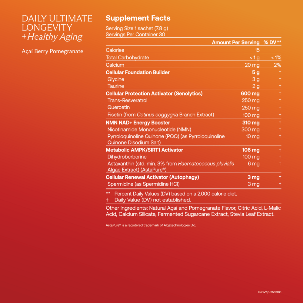 Suggested Use: Empty 1 sachet and mix with 8-10 fl. oz. of cold water, juice or your favorite beverage, preferably in the morning with a meal. For optimal longevity benefits, take together with Daily Ultimate Essentials Drink daily.