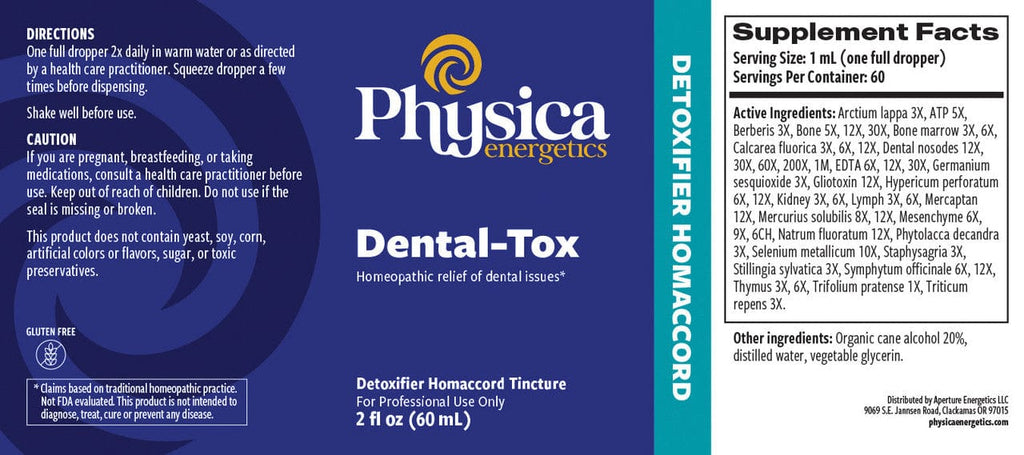 Arctium lappa 3X, ATP 5X, Berberis 3X, bone 5X, 12X, 30X, bone marrow 3X, 6X, Calcarea fluorica 3X, 6X, 12X, dental nosodes 12X, 30X, 60X, 200X, 1M, EDTA 6X, 12X, 30X, Germanium sesquioxide 3X, Gliotoxin 12X, Hypericum perforatum 6X, 12X, kidney 3X, 6X, lymph 3X, 6X, mercaptan 12X, Mercurius solubilis 8X, 12X, mesenchyme 6X, 9X, 6CH, Natrum fluoratum 12X, Phytolacca decandra 3X, Selenium metallicum 10X, Staphysagria 3X, Stillingia sylvatica 3X, Symphytum officinale 6X, 12X, thymus 3X, 6X, Trifolium pratense 1X, Triticum repens 3X.