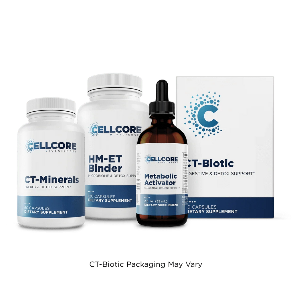 This kit is designed to assist in the body’s natural detoxification processes and support system balance.* It includes four of our most potent supplements for cleansing support that build upon one another: CT-Biotic, Metabolic Activator, CT-Minerals, and HM-ET Binder.