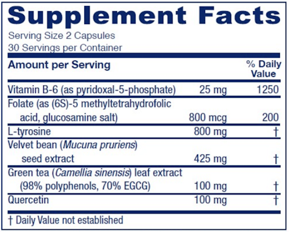 • Tyrosine, Vitamin B6, Green tea, Quercetin and Folate (L‐5‐MTHF) are all synergistic ingredients in maintaining dopamine and promoting a restored and balanced neurotransmitter environment in the brain*