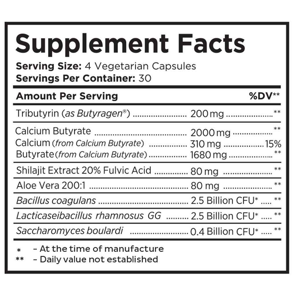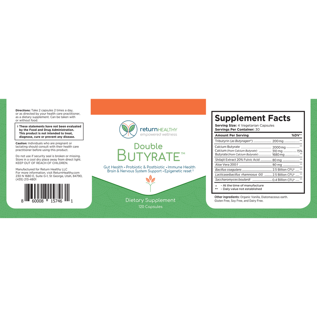 Low-Odor Butyrate: Delivers the critical benefits of butyrate, a short-chain fatty acid essential for gut health, without the off-putting smell Probiotic Support: Features a blend of probiotics including Bacillus coagulans, Lacticaseibacillus rhamnosus GG, and Saccharomyces boulardii, chosen for their immune and histamine-friendly properties Gut-Brain Connection: Enhances communication between the gut and brain, promoting mental and emotional well-being Immune and Inflammatory Support: Aids in managing inflammatory processes and balancing the immune response, crucial for those suffering from MCAS (Mast Cell Activation Syndrome) Gut-Heart Health: Supports cardiovascular health through its beneficial effects on gut health Antioxidant-Rich: Contains Shilajit and aloe vera for their potent antioxidant properties, offering cellular protection against oxidative stress Digestive Comfort: Specially crafted to minimize discomforts like gas and bloating, ensuring a smooth and beneficial gut health regimen What are the benefits of Double Butyrate? Enhances gut health and supports the nervous system Reduces inflammation Aids in improving gut barrier function while nurturing a balanced microbiome and reducing intestinal inflammation Reduces intestinal inflammation Enhances immune response Supports healthy gut-brain axis health Helps prevent fatigue, brain fog, and related conditions Vital for epigenetic regulation Ideal for enhancing cognitive function in children and adults Dual-Action Butyrate Calcium Butyrate: Enhances gut health and supports the nervous system. It’s involved in reducing inflammation and is recognized for its potential in neurological conditions, including FDA approval for ALS treatment with the sodium phenylbutyrate form of butyrate. Tributyrin: Aids in improving gut barrier function and nurturing a balanced microbiome, the key to reducing intestinal inflammation. Shilajit for Barrier and Mitochondrial Function Contains Shilajit, rich in humic and fulvic acids, aiding in gut barrier support and mitochondrial energy production. Aloe Vera for Digestive Health Aloe vera concentrate soothes the digestive system, enhances barrier function, and supports digestive immunity. Probiotic Benefits Bacillus Coagulans & Lacticaseibacillus Rhamnosus GG: These probiotics are celebrated for improving gastrointestinal function, enhancing immune response, and contributing to overall digestive health. Saccharomyces Boulardii: A non-colonizing yeast probiotic beneficial for gut flora balance and managing digestive disorders. Gut-Brain Axis Emphasizes the crucial connection between a healthy gut and brain health, influencing mood, cognitive abilities, and neurodegenerative disease risk. Robust Digestive Barrier A strong gut barrier helps prevent systemic inflammation, fatigue, brain fog, and related conditions. “Double Butyrate” is designed to strengthen this barrier. Epigenetic Impact of Butyrate Histone Deacetylase Inhibitor: Butyrate acts as a histone deacetylase inhibitor, playing a vital role in epigenetic regulation. This action helps reset and reboot cellular functions, steering them away from a cell danger response towards a more natural expression of healthful genetic potential. Transforming Health Histories This epigenetic modulation can shift health trajectories from being non-responsive to lifestyle and dietary changes to unlocking the full genetic potential for health. It mirrors the robust, resilient health of our ancestors, enabling a return to natural, optimal health states over time. Benefits Across All Ages: Ideal for enhancing cognitive function in children and adults, addressing conditions like ADD, ADHD, and autism spectrum disorders, and supporting cognitive health in aging populations.