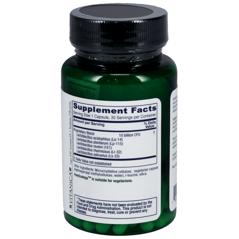 FemEcology is a blend of probiotic species that specifically support the maintenance of healthy vaginal immunity, pH and ecology of microflora; equally beneficial for overall intestinal health maintenance as well.*