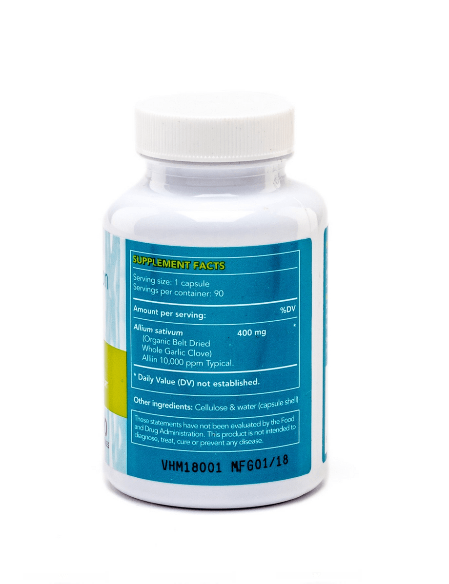 Pure High Actives organic garlic. QAI Certified. Exceptionally potent 26,800 ppm alliin (the industry standard for high potency is 10,000 ppm alliin). Advanced air/belt dying technology. No excipients. 60 capsule per bottle. 500 mg per vegetarian capsule.