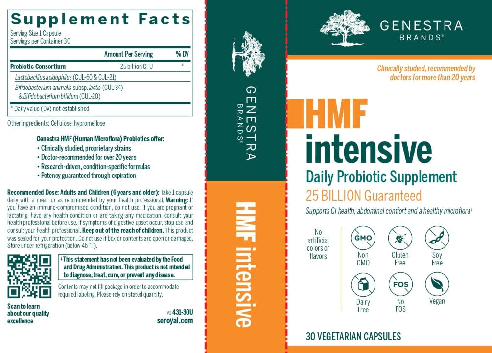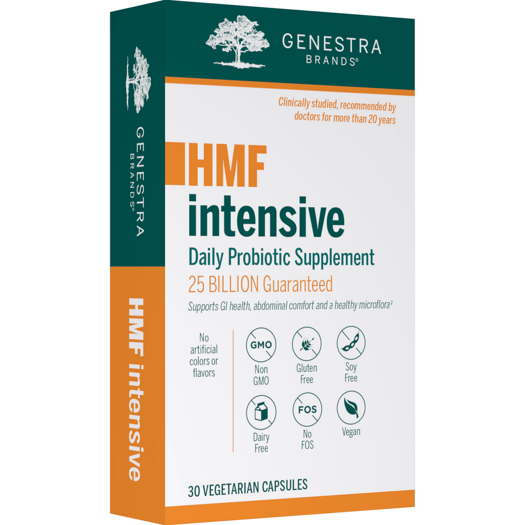 HMF Intensive Capsules provide four strains of proprietary human-sourced probiotics that promote optimal intestinal health in children, adolescents, and adults. Although the microflora composition in the gut is relatively steady, it can be altered by diet, stress, age, and medication use. Probiotics reinforce the epithelial barrier and mediate intestinal permeability by controlling the integrity of tight junctions. Lactobacilli and Bifidobacteria are the most commonly used probiotics, effectively colonize the intestines, and promote the presence of beneficial bacteria to support normal intestinal function. In a randomized, placebo-controlled trial involving 155 adults, daily intake of a probiotic supplement providing 25 billion CFU (containing two strains each of Lactobacillus acidophilus and Bifidobacterium) for 21 days significantly and positively affected the intestinal microbiota.*