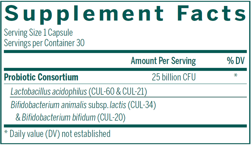 • Provides 25 billion CFU per day of two strains of Lactobacillus acidophilus, Bifidobacterium bifidum, and Bifidobacterium animalis subsp. lactis