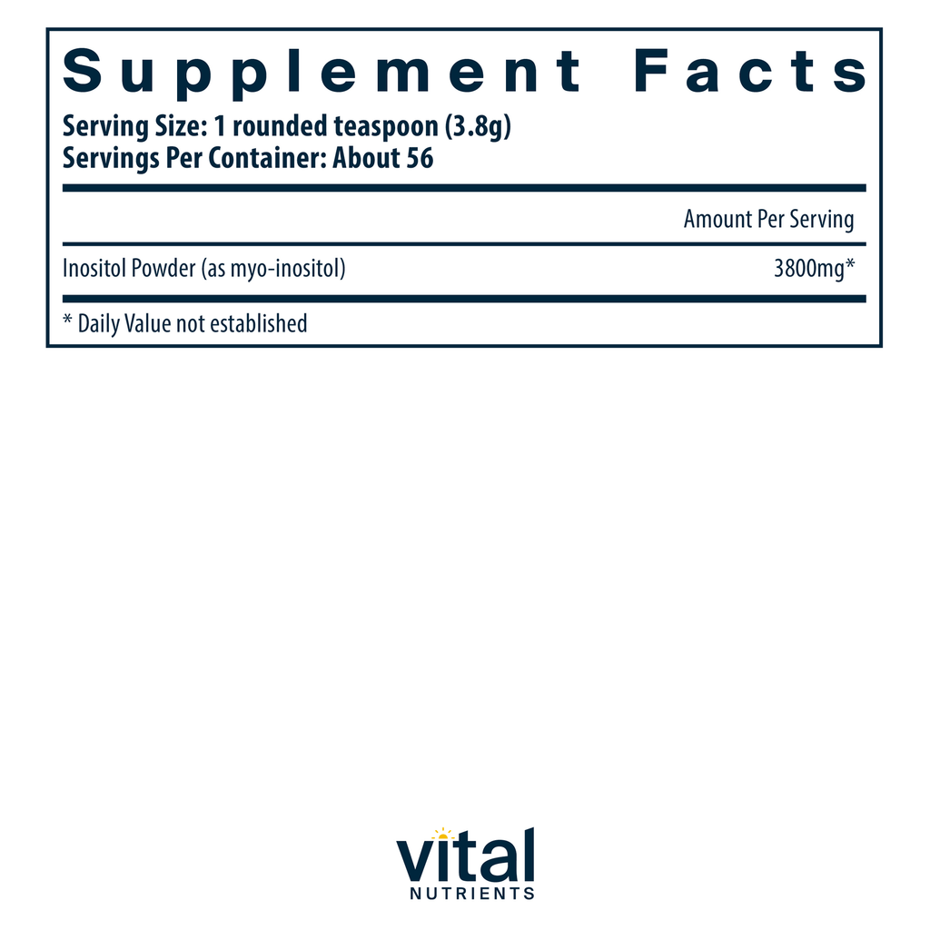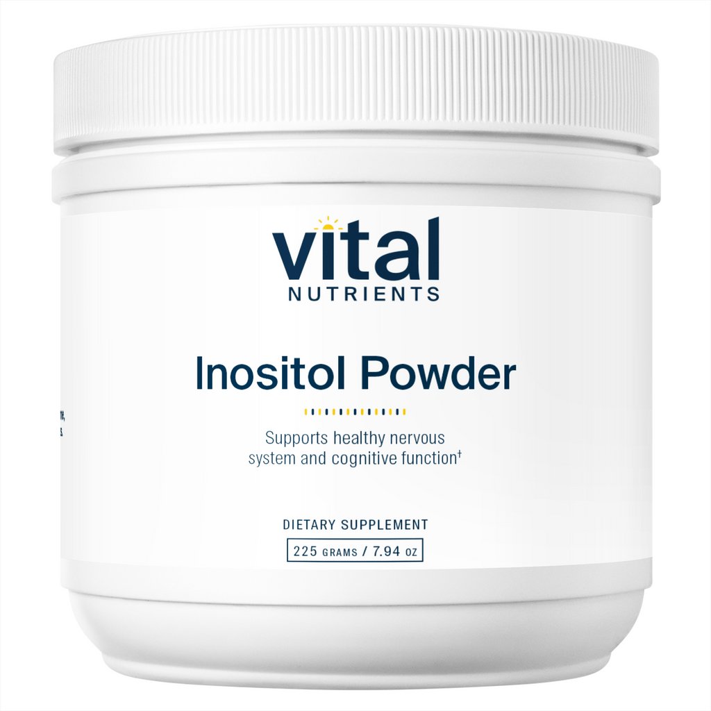 Inositol is a compound found in a wide range of tissues, with higher concentrations in the heart and brain. Inositol Powder may be used to help support and maintain positive mood.* It promotes healthy neurotransmitter metabolism and helps reduce daily stress and occasional anxiety.* Inositol Powder may be beneficial in the transport of cholesterol out of the liver to help maintain already normal-range cholesterol levels.* It may also help maintain healthy blood sugar levels and ovarian function.* Vital Nutrients’ inositol supplement is offered in a powder form which readily dissolves in water and has a slightly sweet taste.*