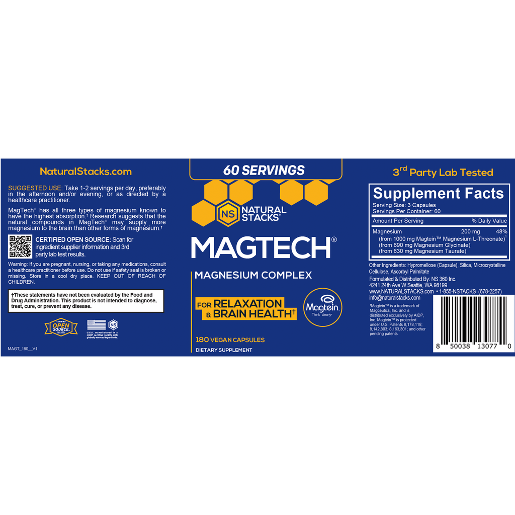 Made with three types of magnesium with the highest absorption rates, L-Threonate, Taurate, and Glycinate, MagTech helps support: