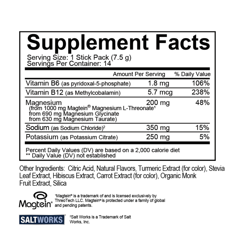 Stay energized and fully hydrated anytime, anywhere. MagTech® Hydrate delivers essential electrolytes in a convenient stick pack to support fluid balance, cellular function, and peak performance.* • Supports electrolyte balance and hydration*• Includes 200 mg Chelated Magnesium, Sodium (350mg), Potassium (250mg) • Enhanced with Vitamin B6 & B12 for brain and energy support*• Non-GMO, Vegan, Gluten-Free, Sugar-Free