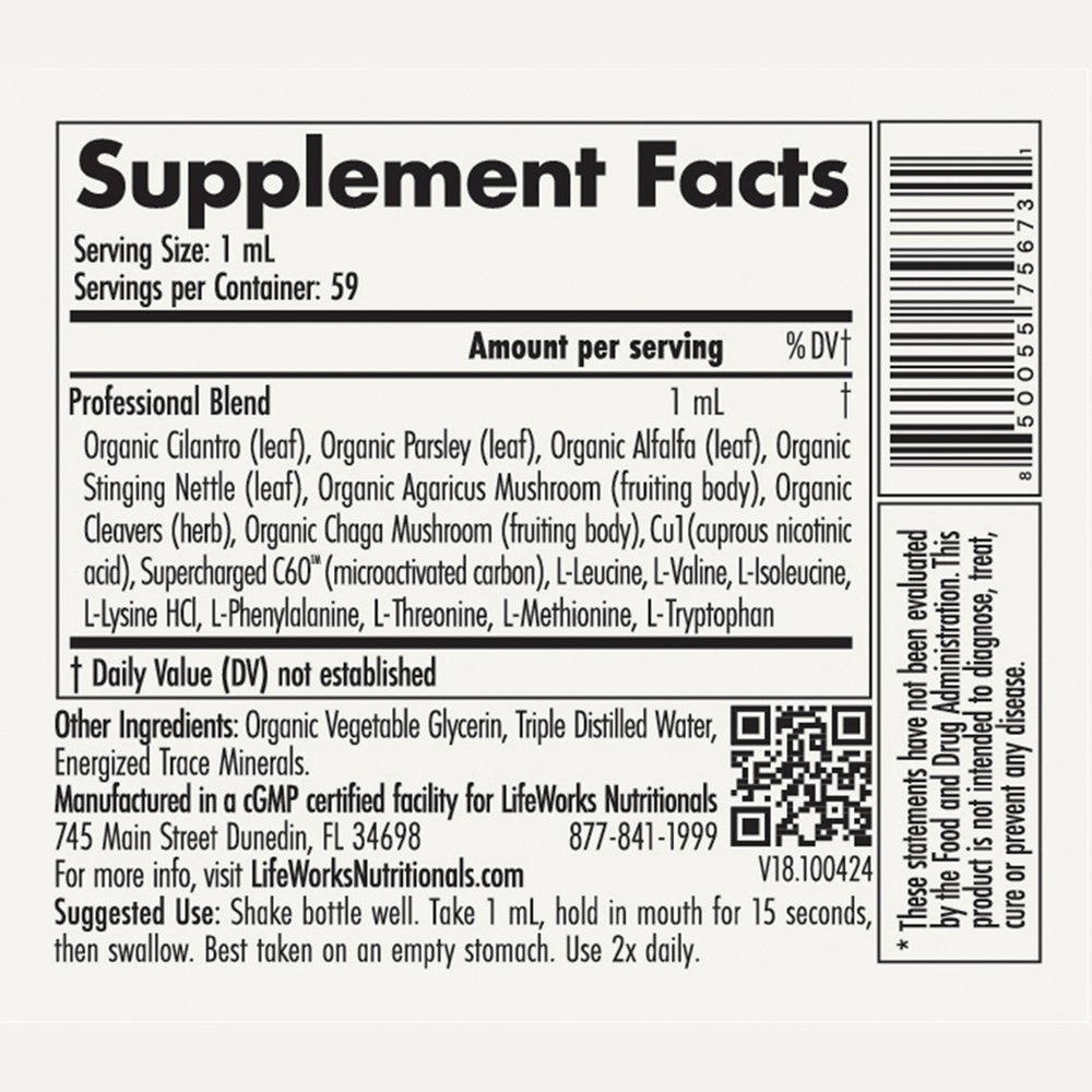 Organic Gilantro (leaf), Organic Parsley (leaf), Organic Alfalfa (leaf), Organic Stinging Nettle (leaf), Organic Agaricus Mushroom (fruiting body), Organic Cleavers (herb), Organic Chaga Mushroom (fruiting body), Cu1 (cuprous nicotinic acid), Supercharged C60° (microactivated carbon), L-Leucine, L-Valine, L-Isoleucine, L-Lysine HCl, L-Phenylalanine, L-Threonine, L-Methionine, L-Tryptophan