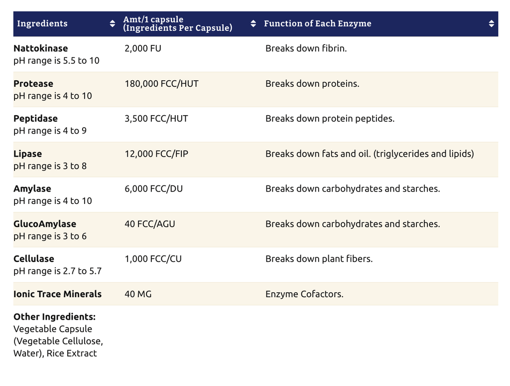 The Natto-LP contains 6 enzymes other than Nattokinase. The purpose of these other enzymes is to help cleanse the body of undigested particles. The most important of these other 6 enzymes is protease, lipase, and peptidase. No other product on the market contains as much protease, lipase, and peptidase in a systemic enzyme formulation. Nattokinase should always be taken with systemic enzymes to help increase the effectiveness of the product.