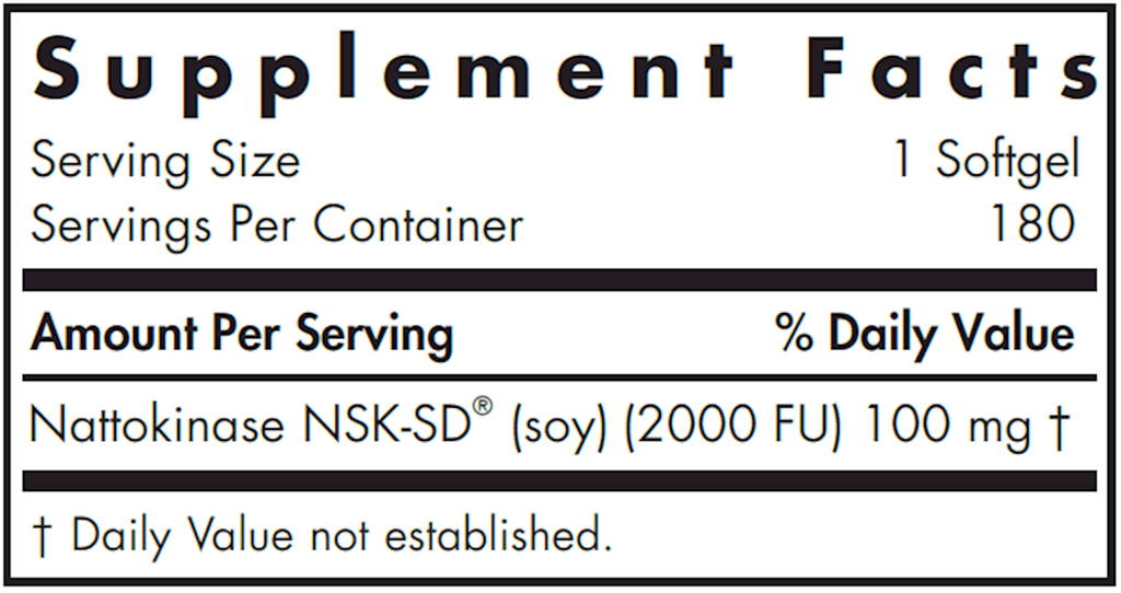 Isolated, purified and encapsulated nattokinase, an enzyme derived from boiled soybeans and a selected, patented strain of Bacillus subtilis natto. Nattokinase NSK-SD® was the first nattokinase introduced into the US market, and it has established standardization and quality levels for all nattokinase, with comprehensive safety studies and proven potency.