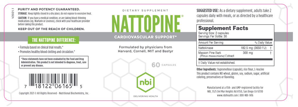 contains the highest dose combination of nattokinase and a pine bark extract to support heart, blood pressure and blood vessel health by promoting healthy blood flow, circulation and healthy blood clotting. NattoPine provides 3650 fibrinolytic units (182.5 mg) nattokinase and 300 mg pine bark extract per serving.