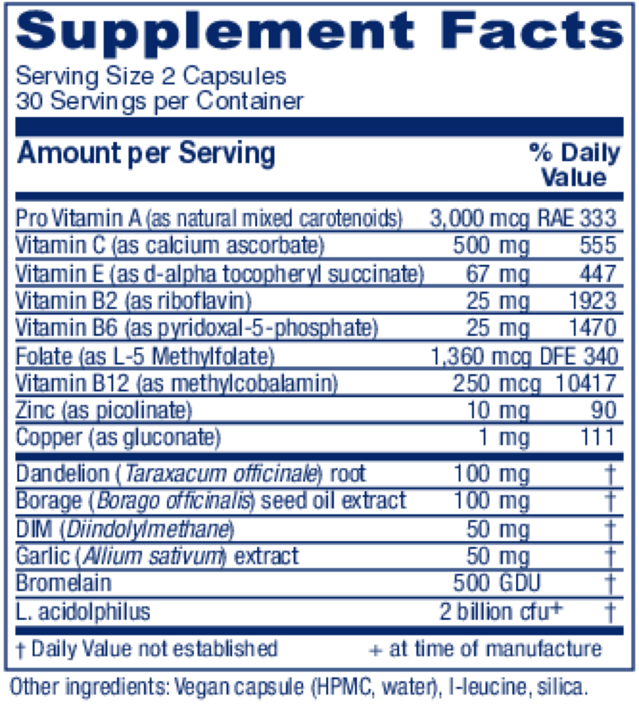 • Other supportive maintenance nutrients: Vitamin E, Borage seed oil (rich in GLA), Beta carotene and Lactobacillus acidophilus