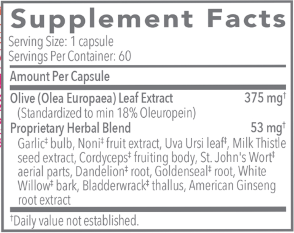 Olive (Olea Europaea) Leaf Extract (Standardized to min 18% Oleuropein), Proprietary Herbal Blend [Garlic bulb, Noni fruit extract, Uva Ursi leaf, Milk Thistle extract seed, Cordyceps mycellium extract, St. John’s Wort, Dandelion root, Goldenseal root, White Willow bark, Bladderwrack thallus, American Ginseng plant extract