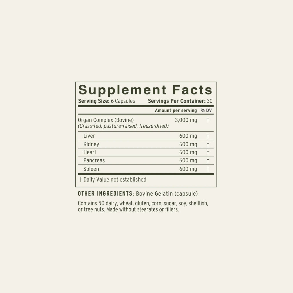This foundational multi-organ formula delivers essential nutrients from five traditionally valued organs—liver, heart, kidney, pancreas, and spleen. Sourced exclusively from grass-fed, pasture-raised New Zealand bovine and gently freeze-dried to preserve integrity, Organ Complex offers a full spectrum of bioavailable vitamins, minerals, enzymes, and peptides to support whole-body health.