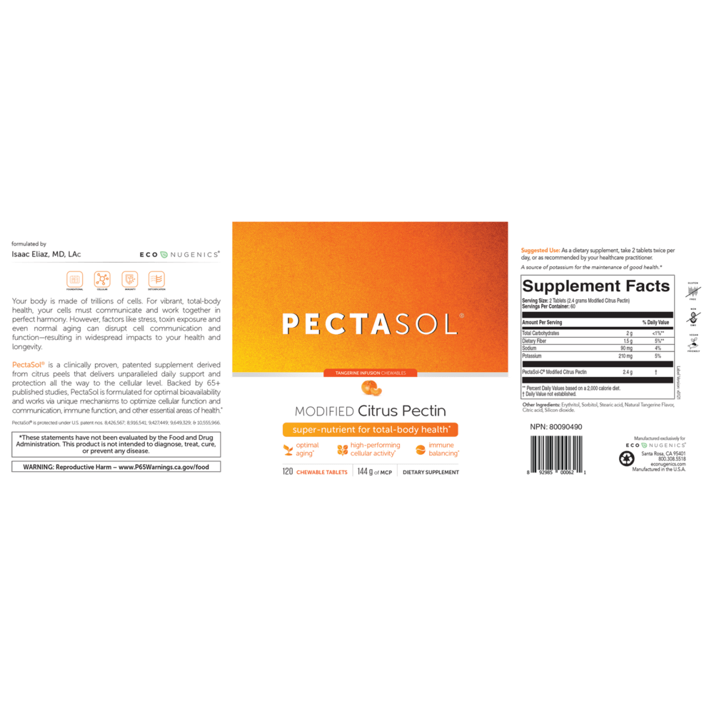 PectaSol® is a clinically proven, patented supplement derived from citrus peels that delivers unparalleled daily support and protection all the way to the cellular level. Backed by 65+ published studies, PectaSol® is formulated for optimal bioavailability and works via unique mechanisms to optimize cellular function and communication, immune function, and other essential areas of health.