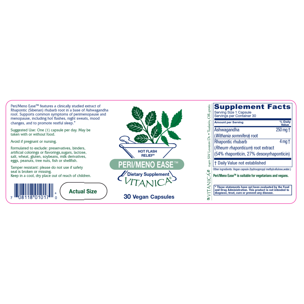 Peri/Meno Ease™ contains Ashwagandha root combined with a clinically studied Siberian rhubarb extract shown to support relief of common symptoms of perimenopause and menopause, including hot flashes, night sweats, mood changes, and to promote restful sleep.*