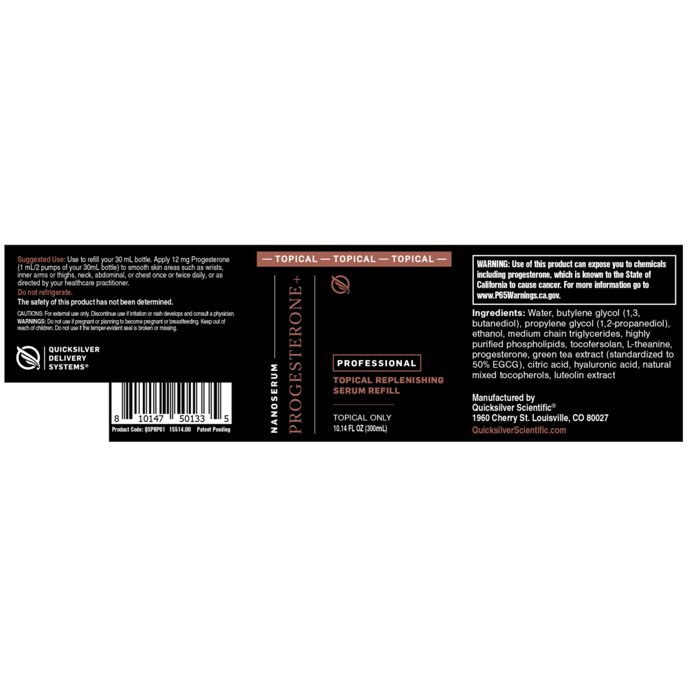 Progesterone+ Replenishing Serum is our patent-pending, nanoemulsified, topical progesterone serum providing 12 mg of bioidentical progesterone per 1mL serving (2 pumps). This 300mL bottle makes replenishing an previously purchased 30mL bottle a simple and effective way of maintaining compliance with your HRT protocol.