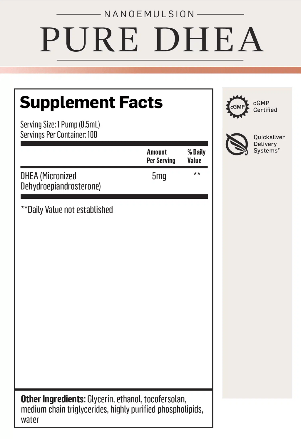Pure DHEA provides a highly bioavailable form of micronized dehydroepiandrosterone (DHEA) in a convenient liquid format for easy titration of dosing. DHEA helps synthesize estrogen and testosterone in the body. Age, stress, and exercise can deplete this foundational hormone.*