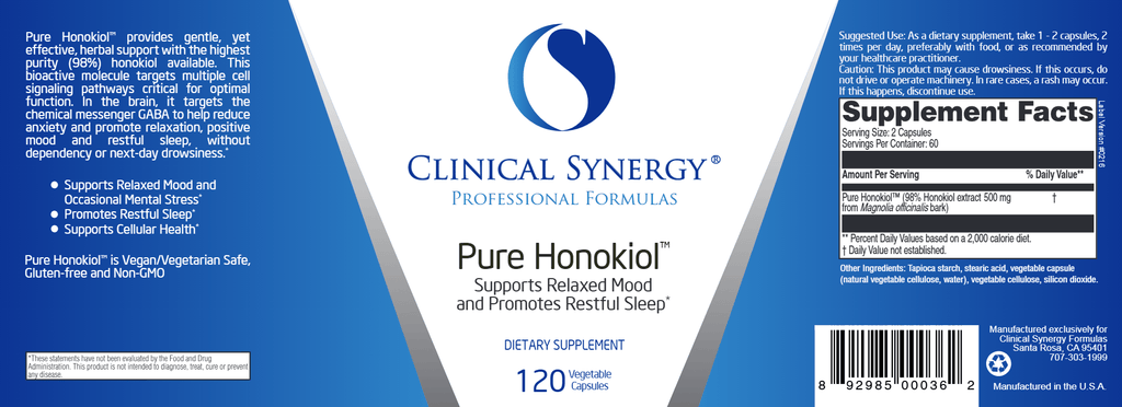 Pure Honokiol provides gentle, yet effective, herbal support with the highest purity (98%) honokiol available. This bioactive molecule targets multiple cell signaling pathways critical for optimal function. In the brain, it targets the neurotransmitter receptor GABAA to help support stress response and promote relaxation, positive mood and restful sleep, without dependency or next-day drowsiness.