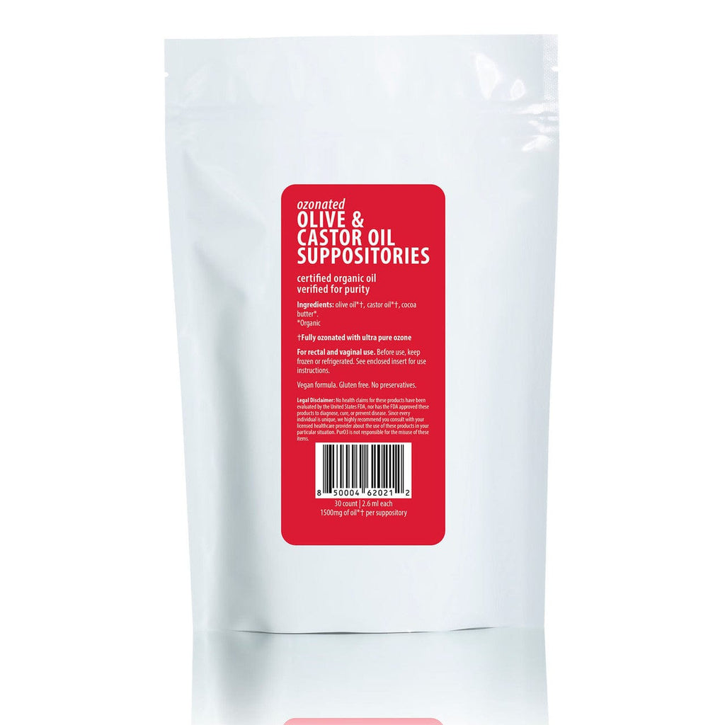 PurO3 ozonated olive and castor oil suppositories are made from organic, extra virgin olive oil, organic castor oil, and high purity ozone.