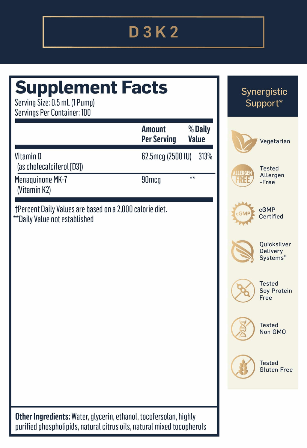 - Each 0.5 mL delivers 2500 IU of vitamin D3 and 90 mcg of vitamin K2. A serving is one pump. Each bottle contains 100 servings.