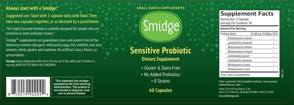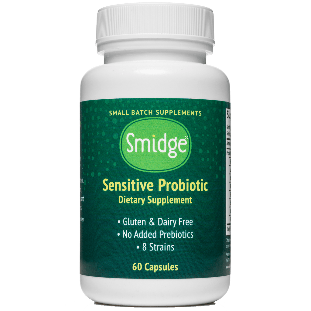 Smidge® Sensitive Probiotic (formerly known as GutPro®) is formulated for people with sensitive digestive systems. Now available in convenient oral capsules! It’s premium and clean, with eight carefully calibrated strains of beneficial gut bacteria. Smidge™ left out probiotic strains that can cause histamine intolerance, D-lactic acidosis or irritation.
