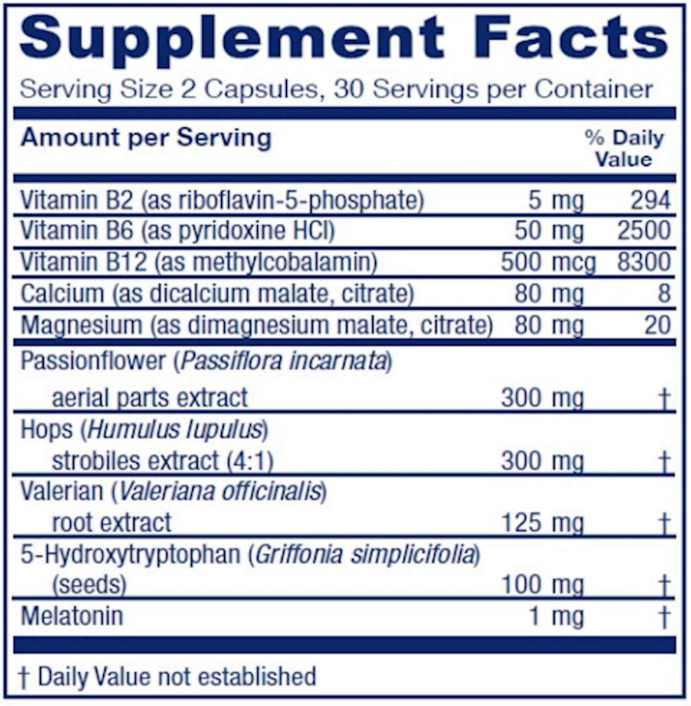Promotes restful and relaxing sleep with a thoughtful blend of quality botanicals and nutrients; maintains a healthy circadian rhythm by supporting serotonin and tryptophan naturally.*