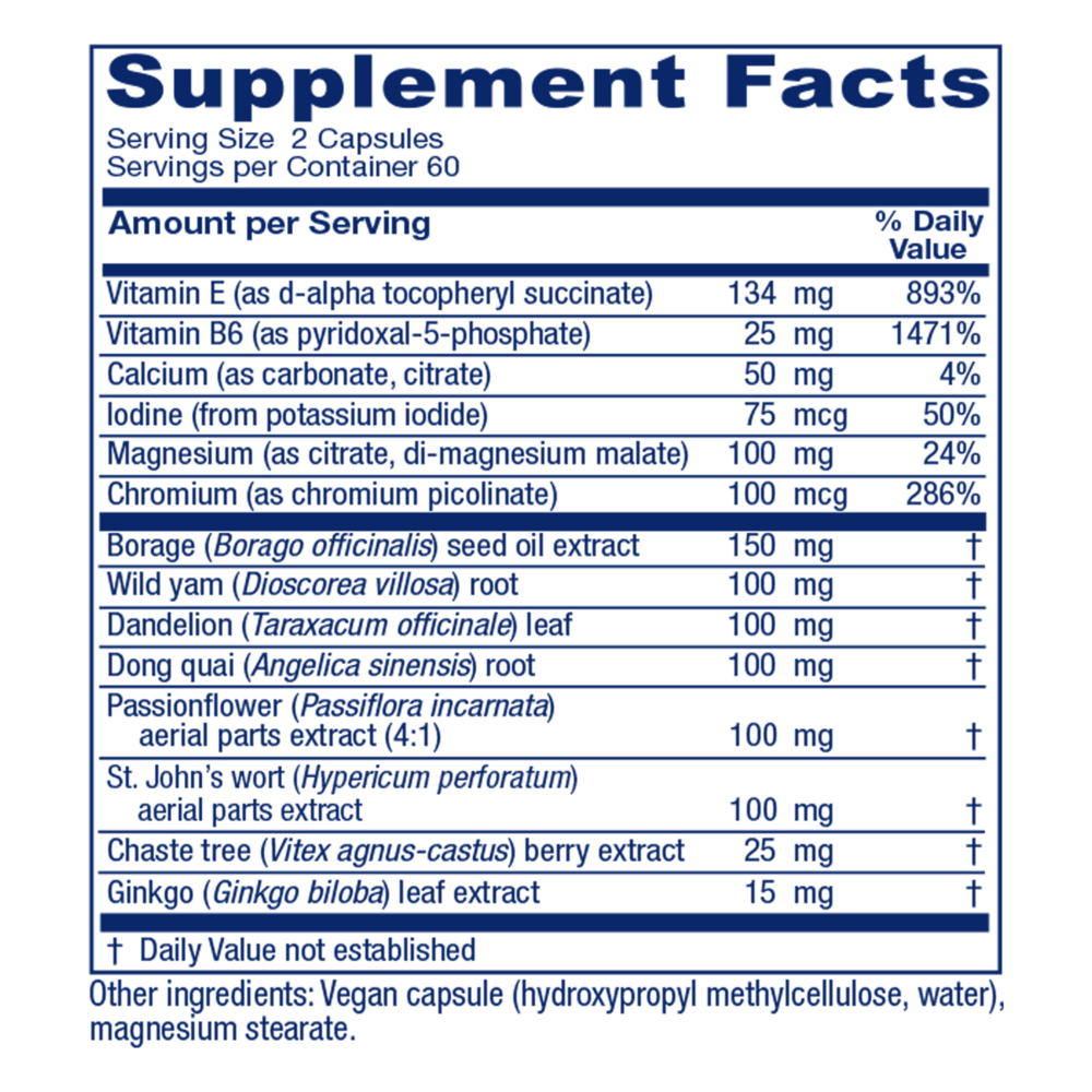 Premenstrual support from all of the well-researched nutrients and herbs studied and observed empirically to promote relief from common PMS as well as overall healthy menstrual cycles throughout.*