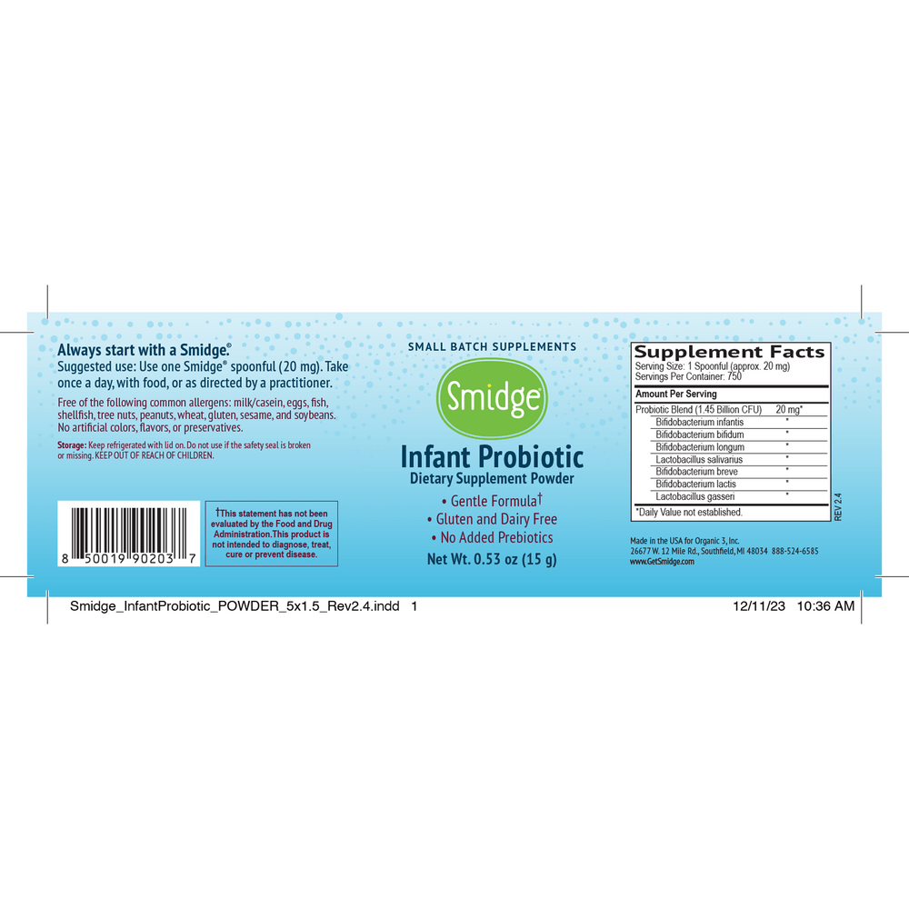 7-strain probiotic. Smidge® Infant Probiotic is the same GutPro® Infant formula you know and love. It’s formulated for a baby’s developing digestive system, from years of research and feedback from parents and health practitioners. With 7 strains of healthy probiotic bacteria found naturally in the digestive tract of a healthy infant, it’s potent enough to colonize the intestines, yet gentle enough for a baby. Infant Probiotic is made of 50% Bifidobacterium infantis, a bacteria strain found in breast milk that’s a vital component of a developing baby’s digestive tract. We’ve eliminated strains that are known to cause histamine intolerance, D-lactate acidosis and other reactions. You also won’t find common allergens, fillers or any synthetic ingredients that can be harmful to new digestive systems. Start your baby on the right track with Infant Probiotics!