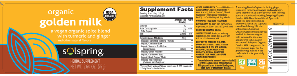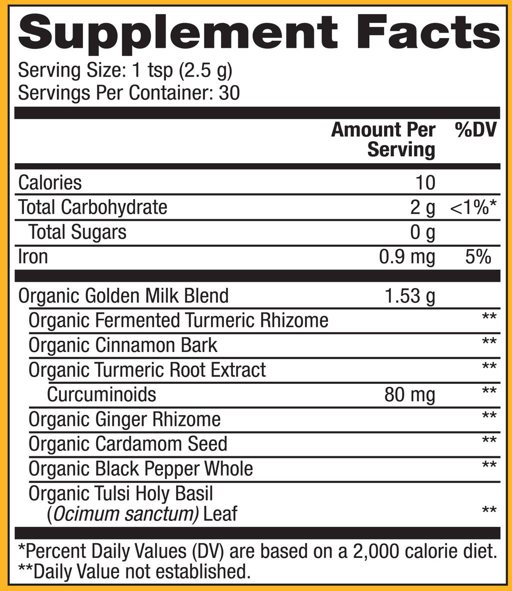 Golden milk is a beverage blend that capitalizes on the benefits of turmeric in combination with other quality ingredients like coconut milk, ginger, cinnamon and more. Dr. Mercola’s premium-quality, vegan Solspring™ Organic Golden Milk is exclusively formulated from a warming blend of spices and herbal ingredients, including fermented turmeric, ginger, cinnamon, black pepper, cardamom and tulsi.