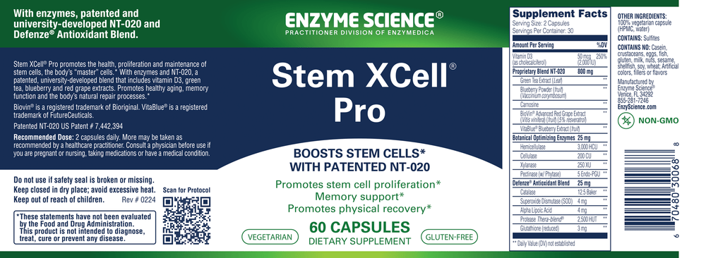 Stem XCell® Pro utilizes NT-020, a patented blend developed at a leading university in Florida, to promote the growth and health of stem cells.* This unique combination blends vitamin D3, herbal ingredients, and plant extracts. This polyphenol-rich formula promotes general health, cognitive function, and supports the body’s natural repair processes.* Enzymes are incorporated to enhance potency and effectiveness in supporting the body’s cellular health.*