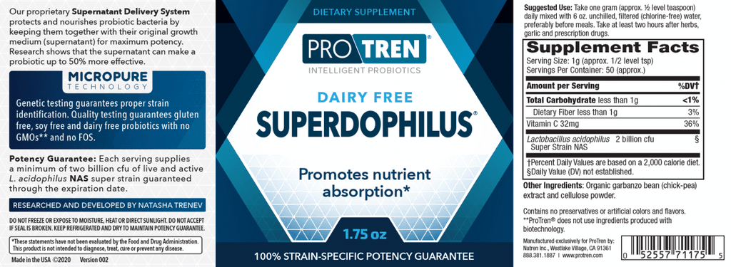 Don't let the seasonal changes get you down! ProTren® SUPERDOPHILUS® powders and capsules are the natural way to maintain a healthy intestinal flora no matter what season of the year. ProTren's SUPERDOPHILUS also aids in digestion and absoprtion. It is also a resident organism in the oral cavity, the vaginal tract and part of the urinary system. Appropriate for vegans and recommended for adults and children over two years of age.