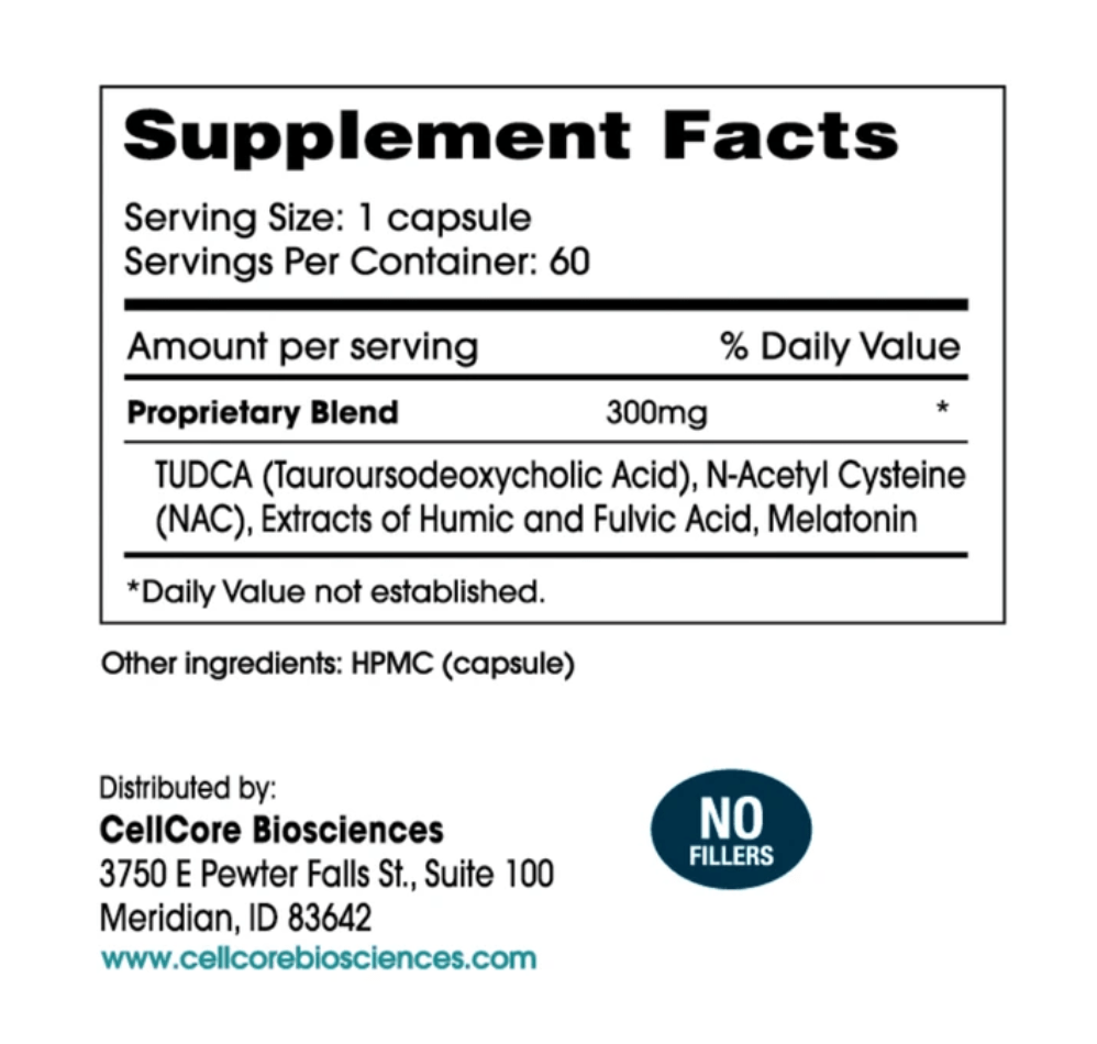 TUDCA, N-Acetyl Cystine, Melatonin, Fulvic Acid, polysaccharides, stearic acid, HPMC.