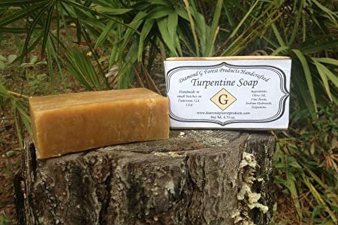 Turpentine Soap is handcrafted from Pine Rosin, Olive Oil, Sodium Hydroxide, and 100% Pure Gum Spirits of Turpentine. All-natural, dye-free, perfume-free.