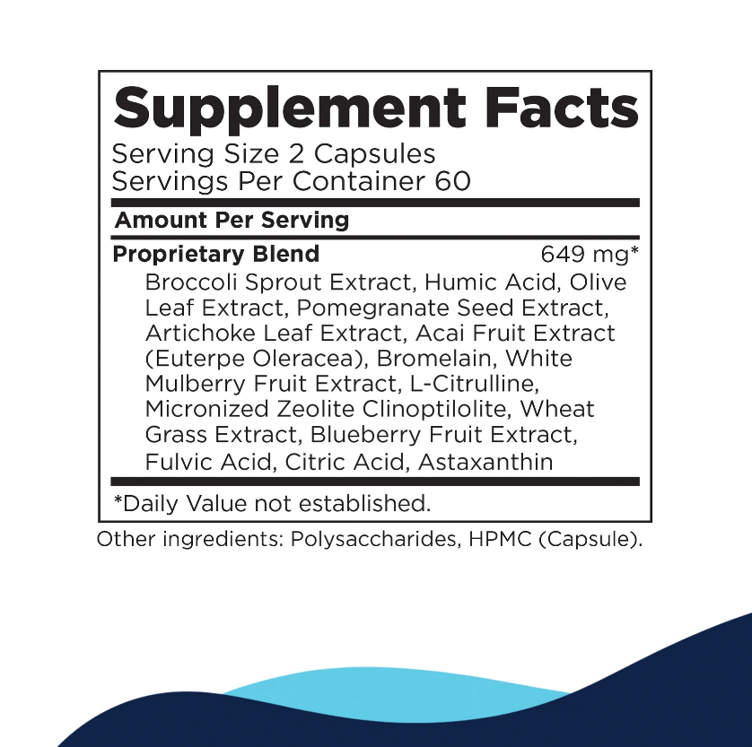 Broccoli Sprout Extract, Humic Acid, Olive Leaf Extract, Pomegranate Seed Extract, Artichoke Leaf Extract, Acai Fruit Extract (Euterpe Oleracea), Bromelain, White Mulberry Fruit Extract, L-Citrulline, Micronized Zeolite Clinoptilolite, Wheat Grass Extract, Blueberry Fruit Extract, Fulvic Acid, Citric Acid, Astaxanthin.